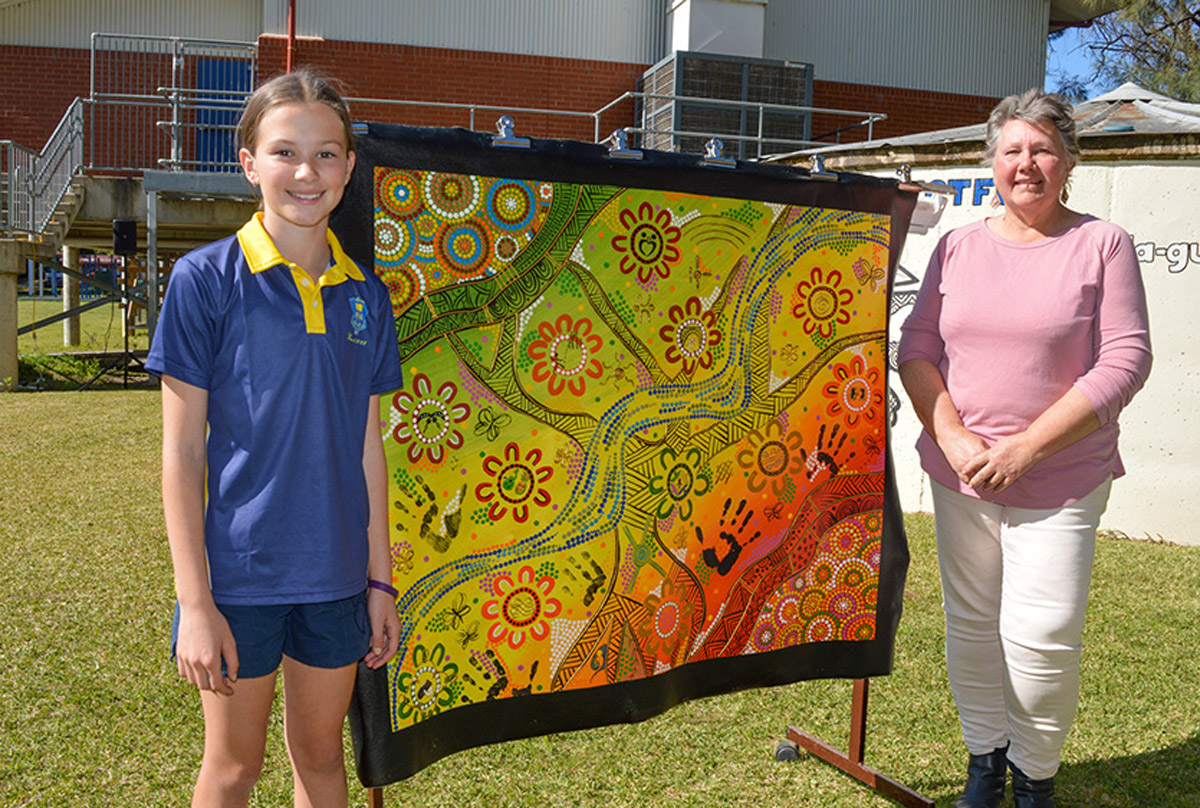 Forbes Public School students Rose Hurford with artist Cheree Stokes and the special painting she made that features tacile dots to invite viewers to touch the artwork and bring them into the present moment.