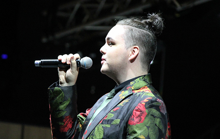 James Whalan from Forbes formed part of the program in the run-up to Overture in Parkes on Saturday night. Here he is seen on the big screen performing a Billy Joel cover.