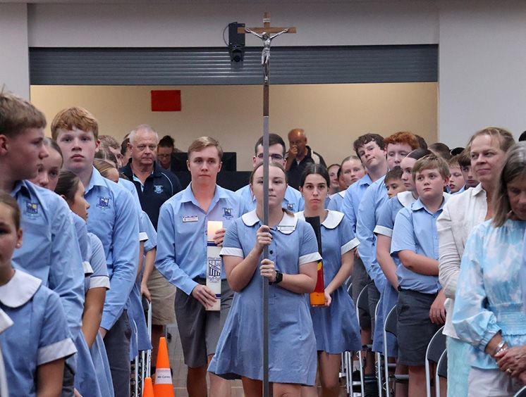 Assembly: The entrance of the cross, candles and Brass Heart by Cooper Holloway, Blake Reeves, Clare Gorton and Camille Murru.