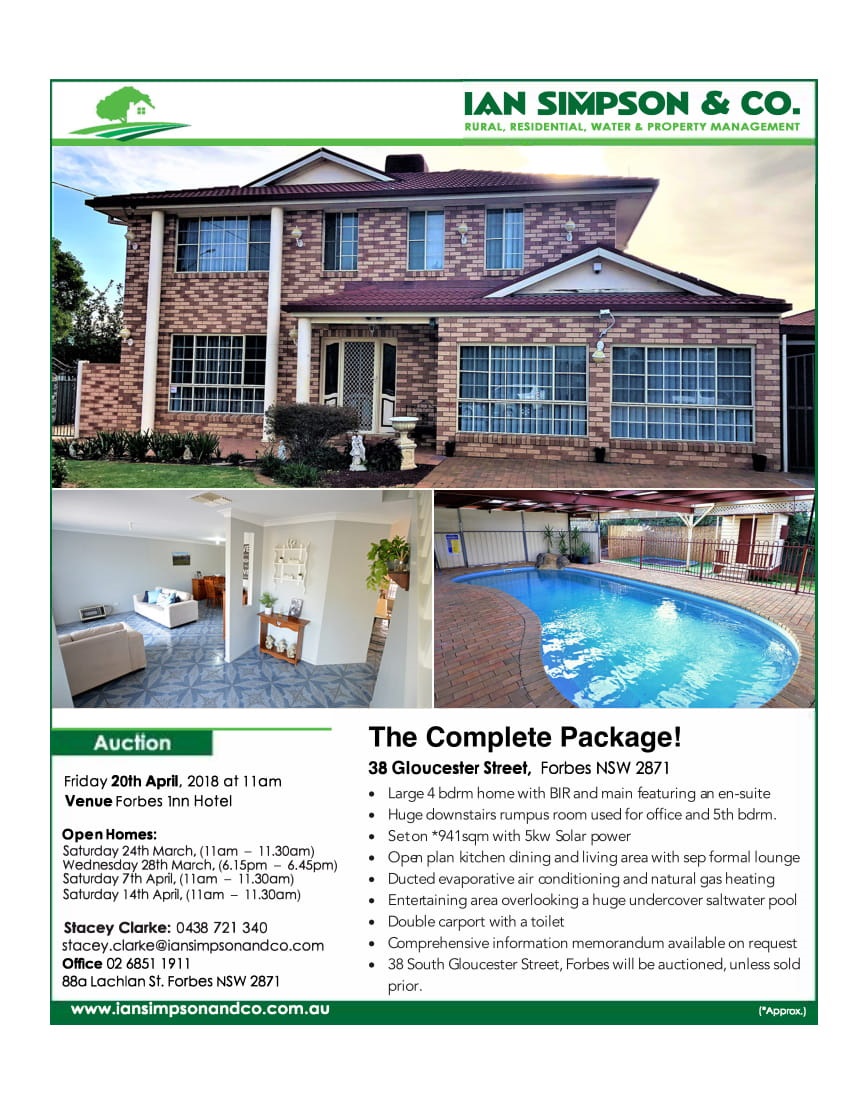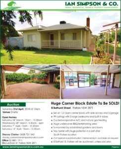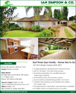 A 113.48ha (280 acre*) irrigation property with a 500ml water entitlement and only 10km* from Forbes is a pretty special find these days. It could be yours to move in on 25th January 2018. “Rodwell” will be auctioned on 14th December unless it is sold prior.